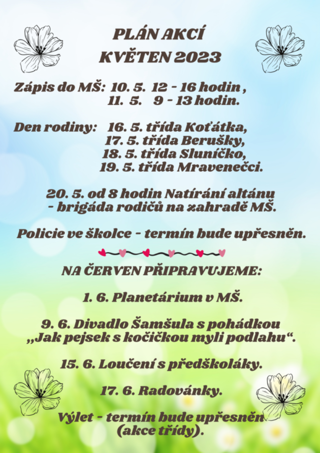 Po návratu z velikonočních prázdnin dne 11. 4. 2023 čekalo děti ve školce překvapení. Měly za úkol hledat poklad, který si pro ně připravil velikonoční zajíček. Mnohým tato skutečnost pomohla překonat návrat z prázdnin mezi kamarády. Hned zrána se děti nemohly dočkat, kdy už vyrazíme na cestu za pokladem. Každá třída měla připravený vlastní program…