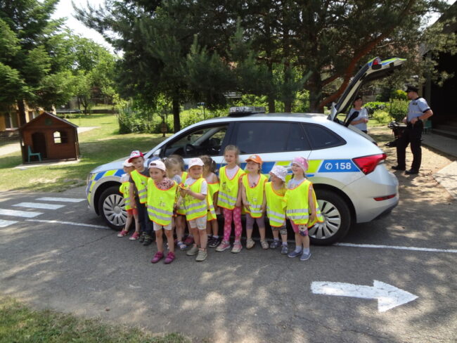 V úterý 20. června zavítal pan policista z místního oddělení na pozvání do naší mateřské školy. S dětmi si přišel popovídat a hravou formou jim vysvětlit, jak správně chodit po chodníku a přecházet silnici, co znamenají barvy na semaforech a nač má policista zastavovací terčík a reflexní vestu. Ukázal také vybavení ochránců zákona, velký dojem na ně udělal…