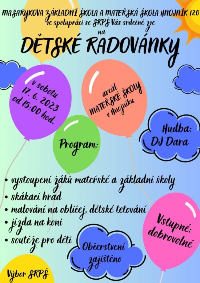 Spolek rodičů a přátel Masarykovy ZŠ a MŠ Hnojník, z. s. ve spolupráci s Masarykovou Základní školou a mateřskou školou Hnojník 120 pořádá  v sobotu 17. června 2023 od 15:00 hodin v areálu Mateřské školy v Hnojníku Dětské radovánky. Na Vaši návštěvu se těší děti, žáci a zaměstnanci základní a mateřské školy.