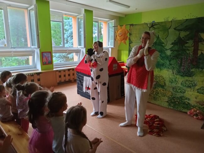 Za dětmi do školičky přijelo v pátek 9. 6. divadlo Šamšula s pohádkou “Jak pejsek a kočička myli podlahu”. Dozvěděly se, jak to bylo tenkrát, když pejsek a kočička ještě spolu hospodařili, měli v lese malý domeček a tam spolu bydleli a chtěli všechno dělat tak, jak to dělají velcí lidé. S pomocí dětí se…