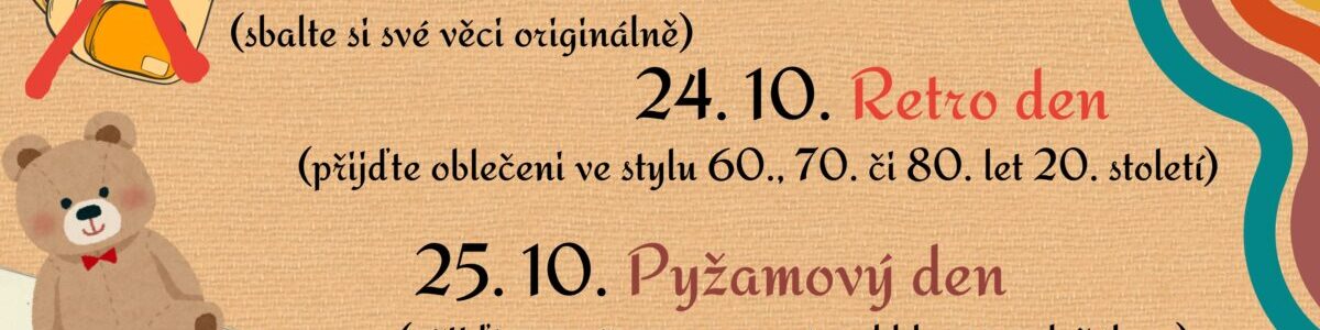 Pátek 25. října byl náš závěrečný „bláznivý“ den. Tento den byl pohodový a značně ležérní, nejen žáci přišli oblečeni v pyžamu či županu. Mnozí si s sebou přinesli oblíbeného plyšáka nebo polštářek.