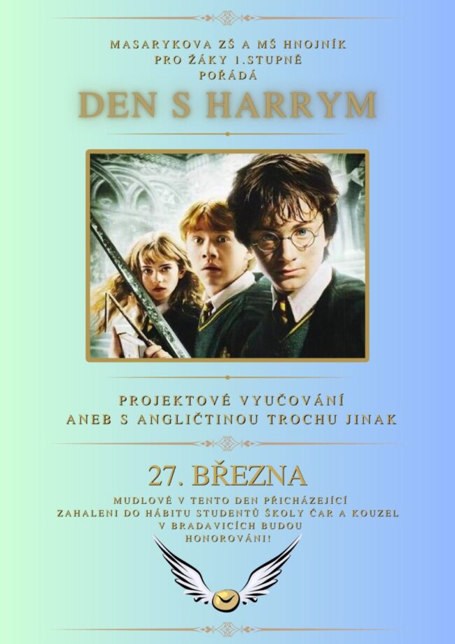Chceš s námi zažít skutečně netradiční projektové vyučování naplněné poutavými kvízy a úkoly v anglickém jazyce? Přijď ve středu 27. 3. 2024 v kostýmu studenta proslulé kouzelnické školy a získej Potterovskou odměnu! Bližší informace o této akci, která se pro všechny (i pro běžně oděné!) žáky 1. stupně na tento den chystá, obdržíte ve škole u svých třídních učitelek. Věříme, že…