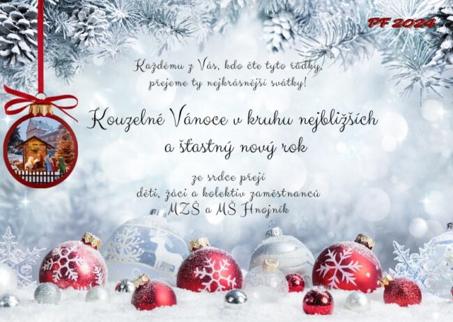 Milé děti, vážení rodiče a přátelé školy, jsou zde opět Vánoce, ten krásný čas milých rodinných setkání, rozzářených dětských očí, čas porozumění, klidu a harmonie. Přejeme Vám, aby tyto nejkrásnější svátky byly naplněné štěstím, radostí a společně strávenými okamžiky. V novém roce ať zdraví, láska a spokojenost tvoří pevné pouto. Dagmar Tobolová a kolektiv zaměstnanců…
