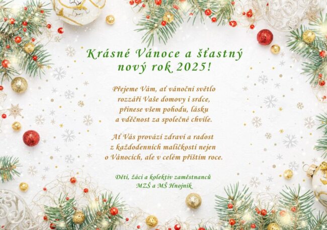 Vážení rodiče, milí žáci a všichni přátelé školy, s blížícími se vánočními svátky nastává čas, kdy se zastavíme a strávíme milé chvíle s našimi blízkými. Přejeme Vám všem, abyste tento kouzelný čas prožili radostně a pokojně. Ať se Vám splní všechna důležitá přání a nový rok přinese všem mnoho zdraví, štěstí a osobní spokojenosti. Děkujeme…