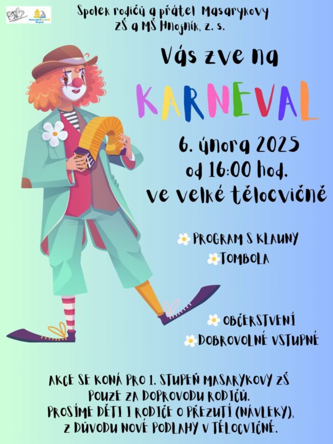 Rok utekl jako voda a my Vás opět všechny zveme na dětský karneval! Přijďte si s kamarády užít odpoledne plné zábavy, oblíbených písniček, nápaditých masek a výborného občerstvení.   Těšíme se na Vás! Vaše SRPŠ