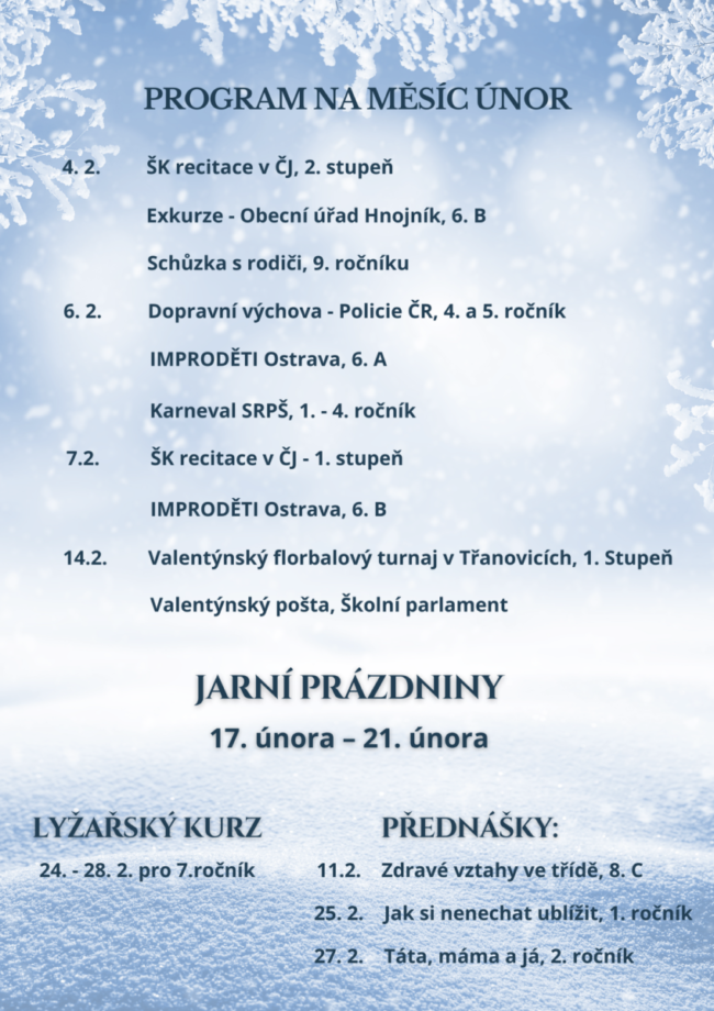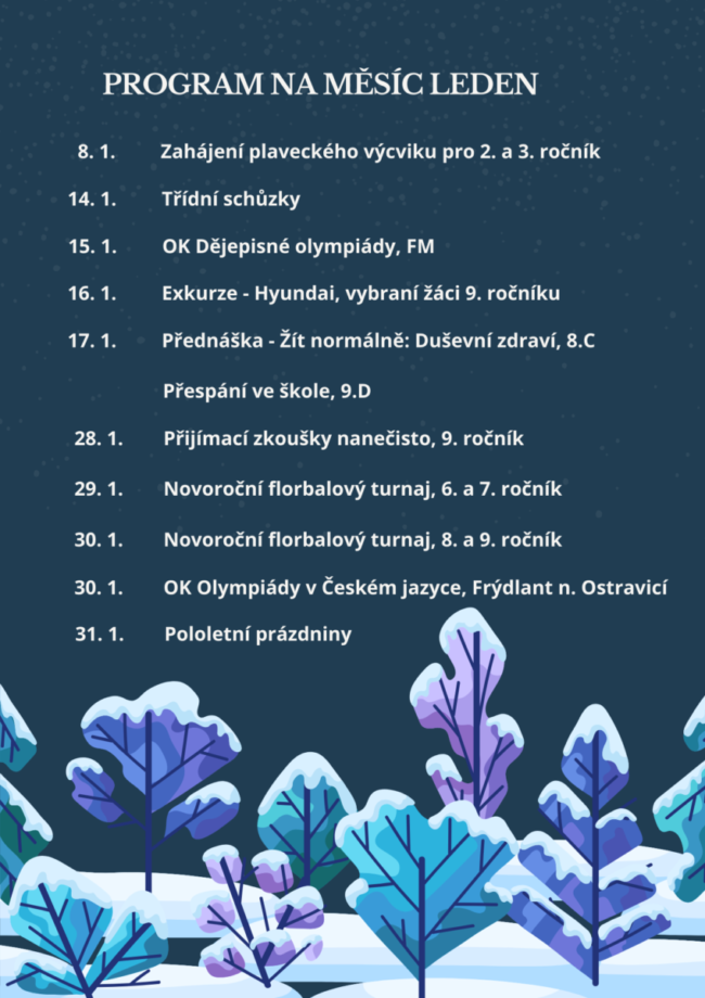 Vážení rodiče, vážení zákonní zástupci žáků, v úterý 14. ledna 2025 proběhnou v čase od 16:00 do 18:00 hodin pro vybrané třídy třídní schůzky. Pro ostatní třídy budou probíhat individuální konzultace s třídním učitelem dle naplánovaného harmonogramu. Bližší informace o schůzce obdržíte od třídních učitelů. 16:00 – 17:00 společné třídní schůzky v kmenové třídě – jen…