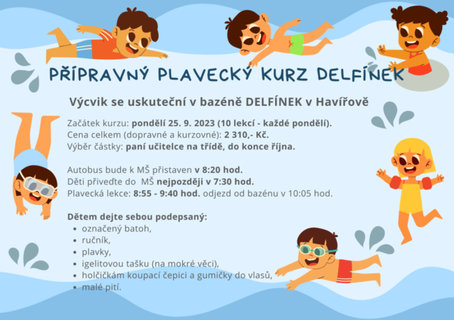 V pondělí 25. 9. 2023 vyrazí 25 předškoláků na první lekci plaveckého kurzu Delfínek v Havířově. Děti čeká postupně 10 lekcí – každé pondělí. Všichni se již na vodní hrátky těšíme a jsme zvědaví, co nového se děti během podzimního plavání naučí.