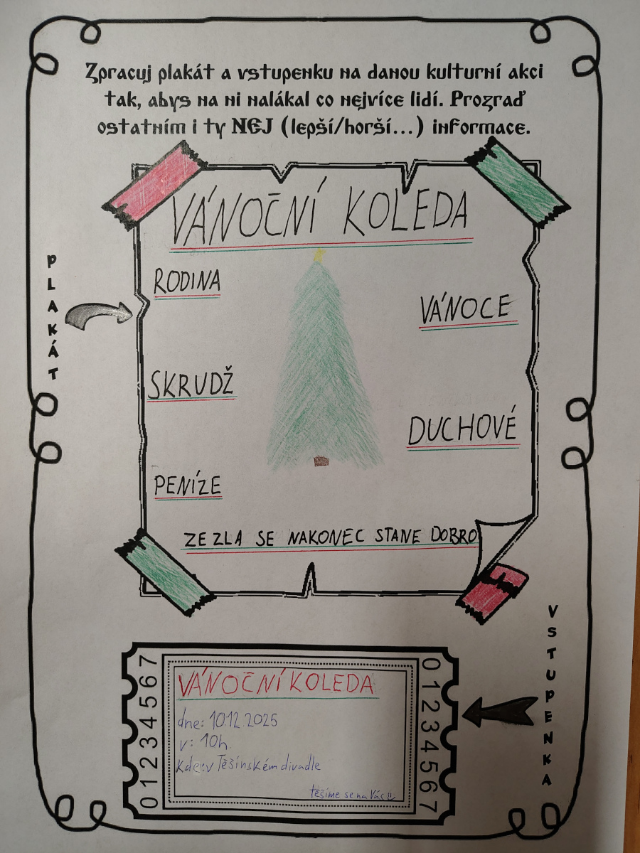 Ve středu 3. prosince mohli naši žáci 7. ročníku nasát vánoční atmosféru díky zhlédnutému divadelnímu představení Vánoční koleda, které vzniklo v Těšínském divadle jako adaptace již klasické novely anglického spisovatele Charlese Dickense. Čerstvě zrekonstruované divadlo nabídlo dětem magický příběh o proměně chamtivého obchodníka a o překvapivých podobách Vánoc. Známé koledy v živém provedení, světelné efekty i autorské písně dokreslovaly zdařilé ztvárnění Dickensova poselství, na čem o Vánocích doopravdy záleží.